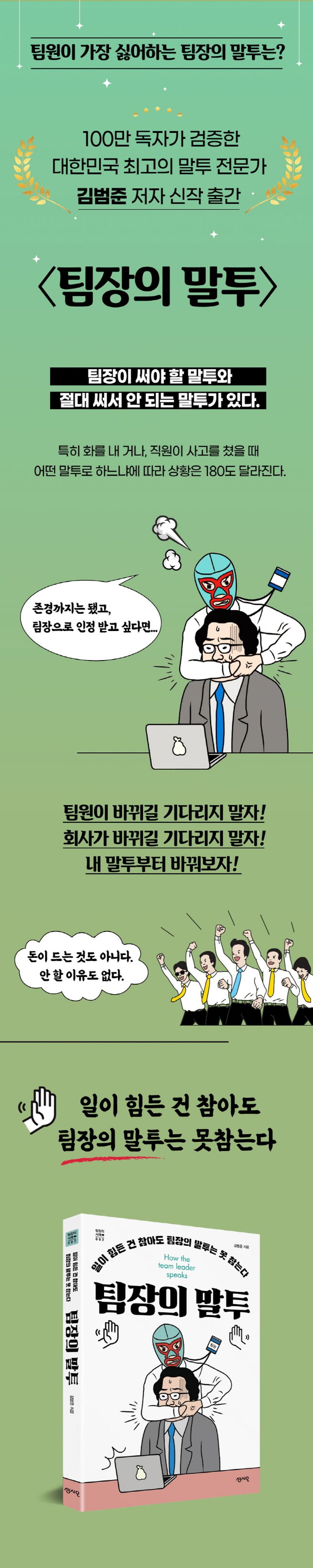 100만 독자가 검증한 대한민국 최고의 말투 전문가 김범준 저자는 상황에 따라서 팀장이 써야 할 말투와 절대 써서는 안 되는 말투가 있다고 말한다. 특히 화를 내거나, 직원이 사고를 쳤을 때 어떤 말투로 하느냐에 따라 상황은 180도 달라진다고 말한다.