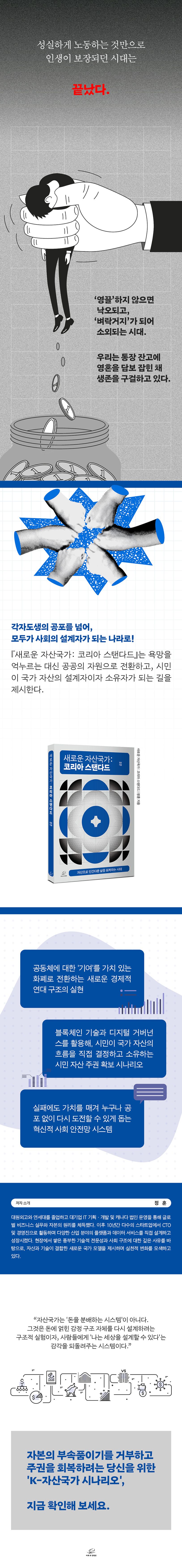 이 들끓는 욕망을 개인의 경쟁으로 소모하는 대신, 사회적인 차원에서 축적하고 잘 쓸 수는 없을까? 《새로운 자산국가: 코리아 스탠다드》는 바로 이 질문에서 출발한다. 개인의 기여가 자신의 자산이자 사회 전체의 자산이 되는 순환 구조, 그것이 바로 이 책이 말하는 '자산국가'다.