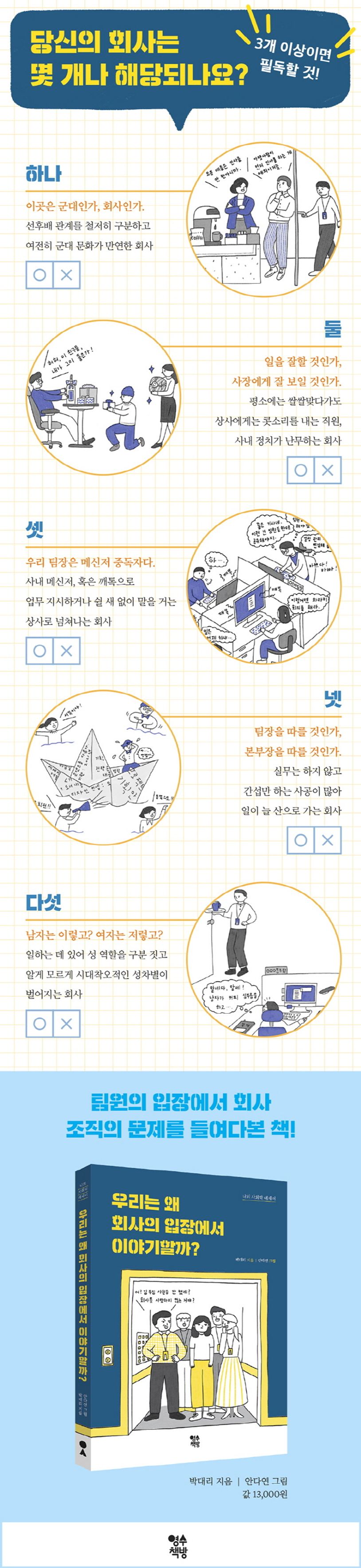 이 책에서는 저자와 주변 동료의 경험을 통해 직장인이 회사의 입장에서 이야기하는 이유를 찾는 과정을 담았다. 그 과정 속에서 조직 문제를 파헤치고, 조직 문제를 풀 수 있는 방법을 제시했다.
